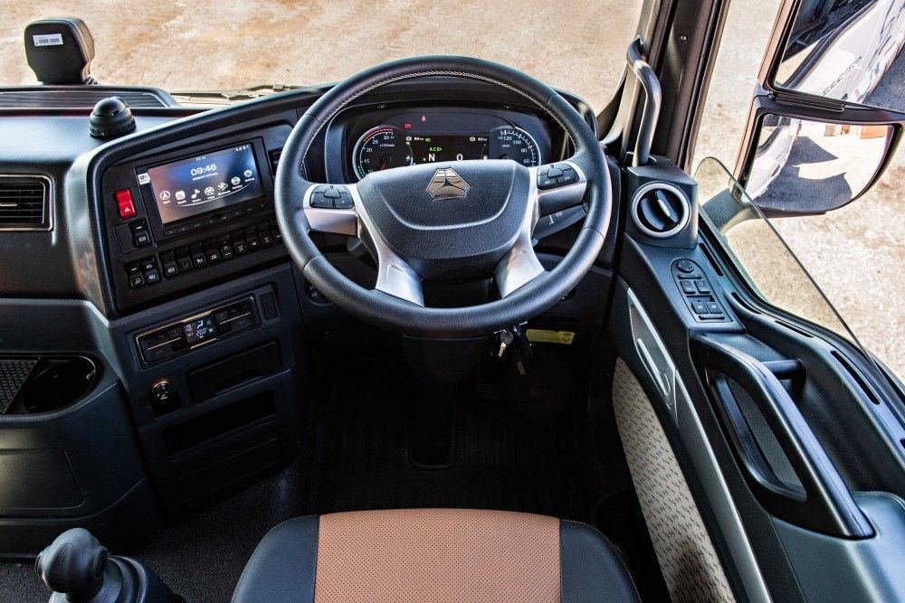 Sitrak’s T5G rigid has a 330hp/1250Nm MAN 6.87-litre engine and 10-speed AMT gearbox with Wabco technology. It has a GVM of 25,000kg and GCM of 42,000kg.